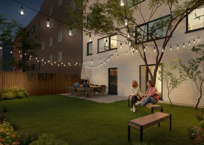 De leefruimte combineert een open keuken met eet- en zithoek en baadt in het licht dankzij grote ramen die uitgeven op een gezellig terras. Bovendien is er ook een gemeenschappelijke tuin, waar bewoners in alle rust kunnen ontspannen.