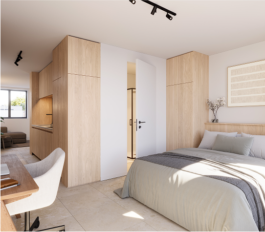 Uw appartement is slim ingedeeld met een ruime leefruimte, knusse slaapkamer en ensuite badkamer. Grote ramen zorgen voor veel licht, terwijl duurzame technieken zoals warmtepompen, zonnepanelen en vloerverwarming zorgen voor lage energiekosten en maximaal comfort.