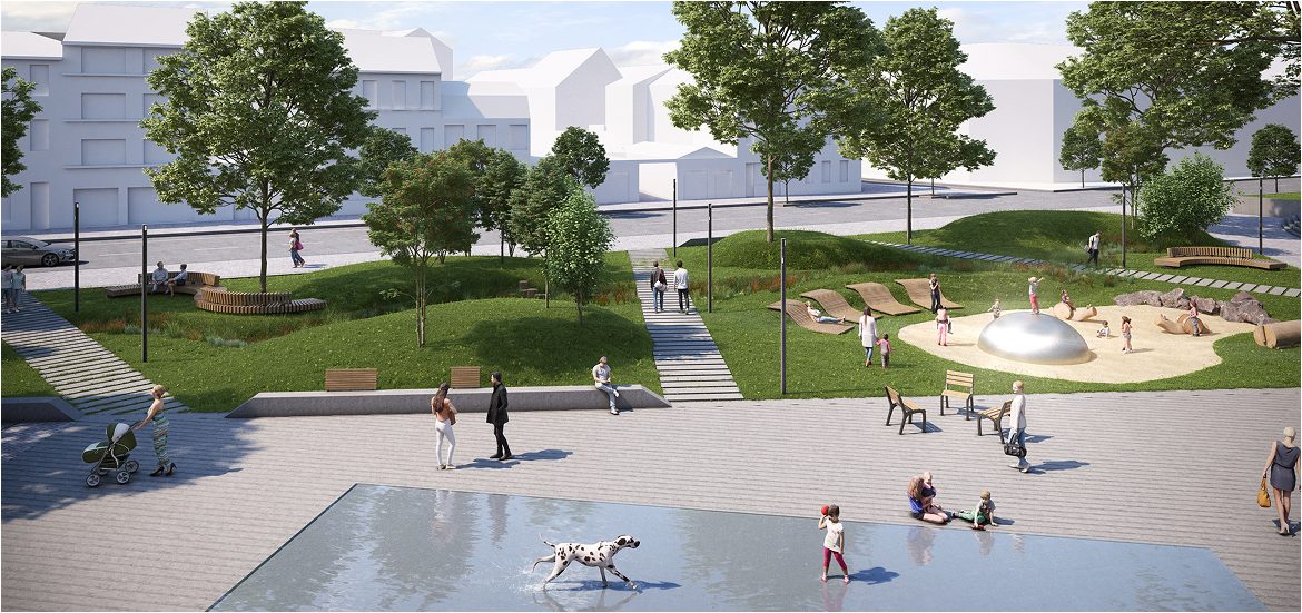 De groene tuinen van het project creeren een oase van rust en ontspanning.