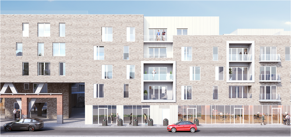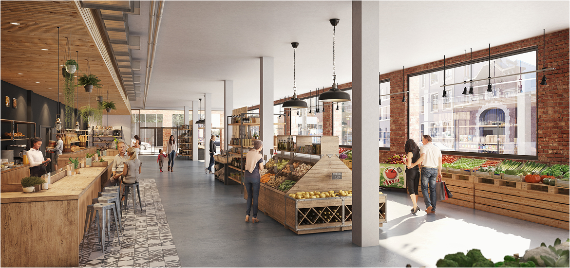 De commerciele ruimte op het gelijkvloers is bestemd voor een supermarkt, be-heerd door de stad namen.
