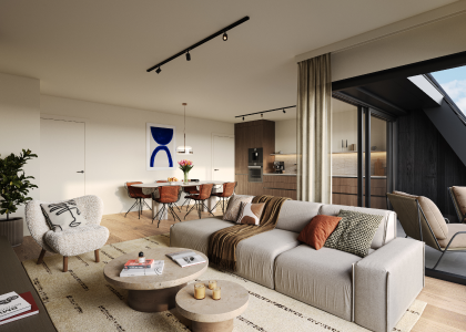 De leefruimtes zijn lichtrijk, dankzij grote ramen die overvloedig daglicht binnenlaten. Hier vind je een gezellige zithoek, een eethoek en een moderne open keuken. En via het schuifraam stap je zo op je eigen terras – een heerlijke plek om te ontspannen.