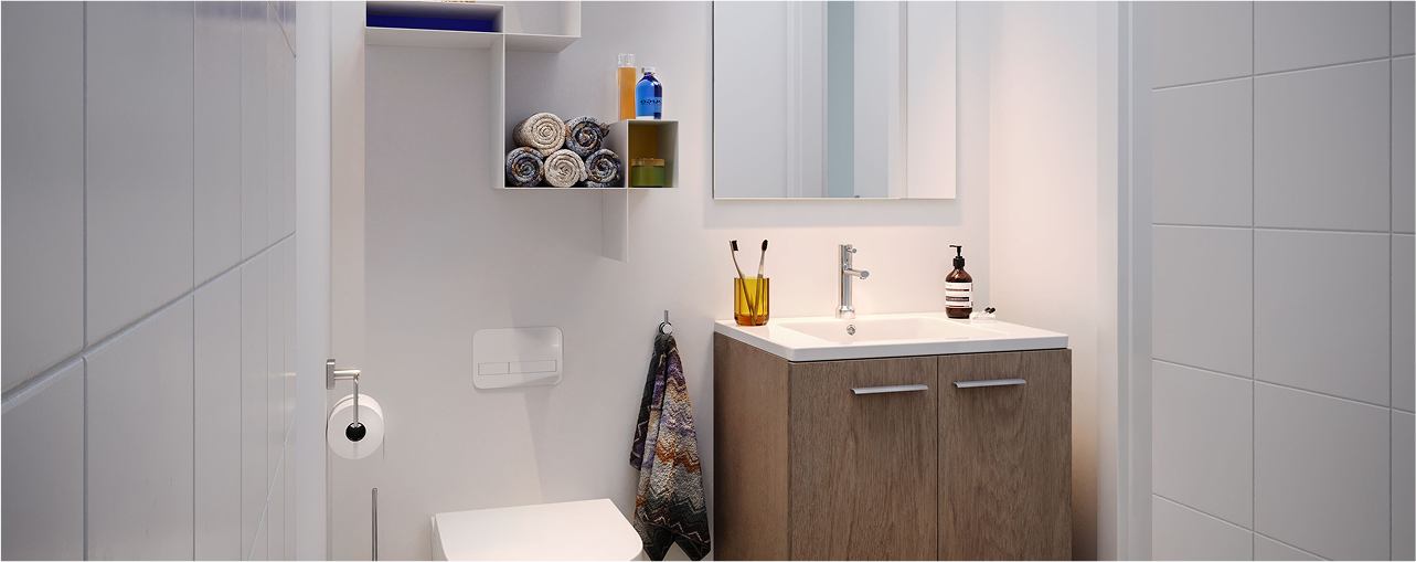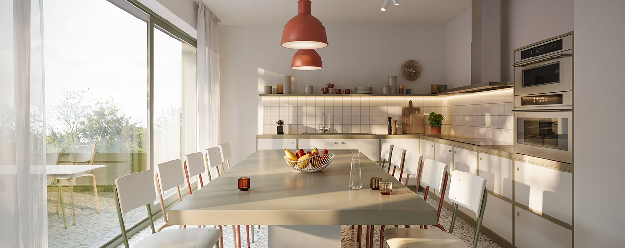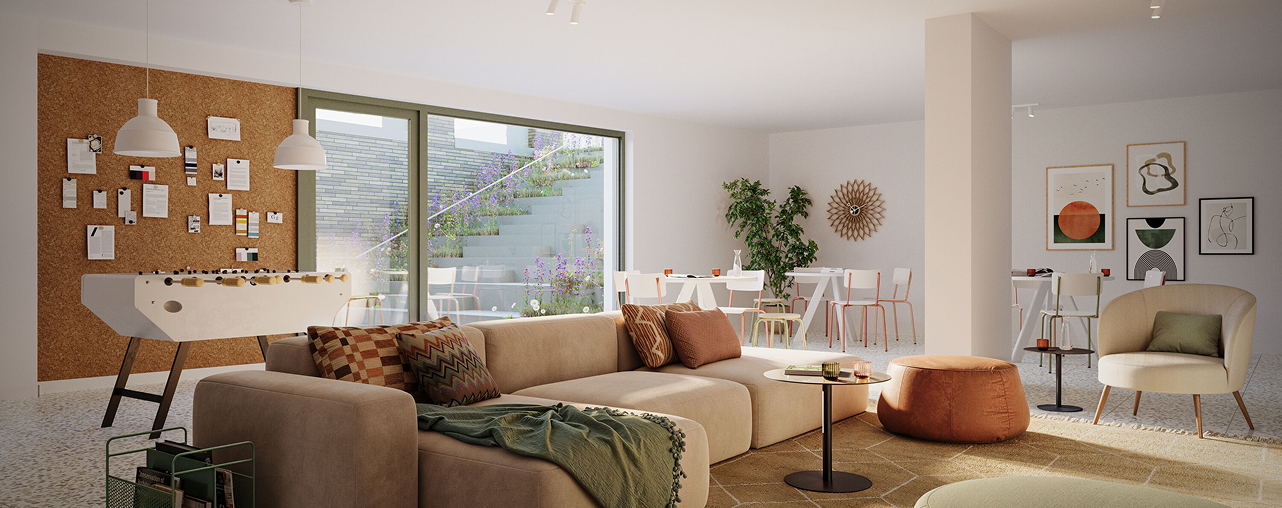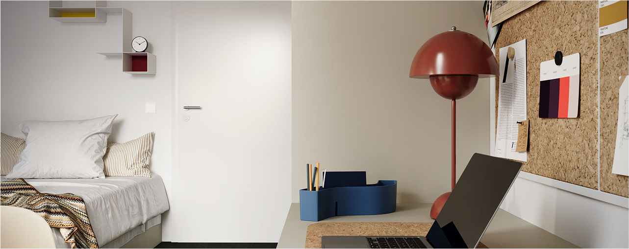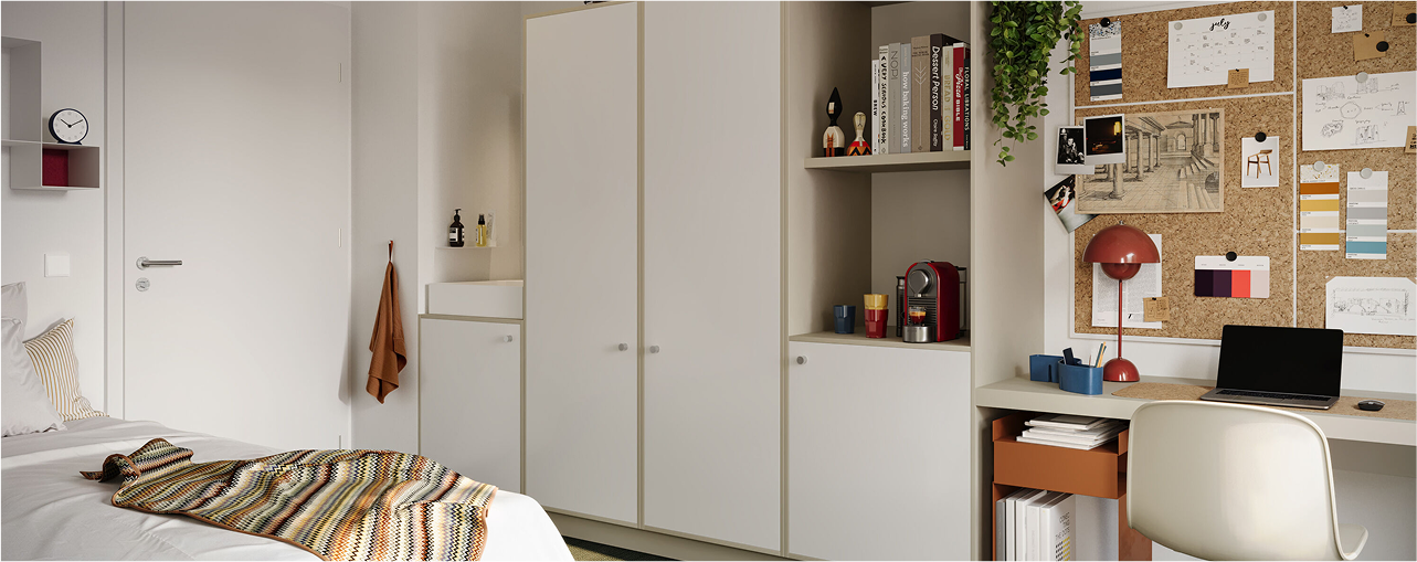 Elke studentenkamer wordt volledig afgewerkt met hoogwaardig vast meubilair, gordijnen, verlichting en geschilderd interieur. Er is keuze tussen kamers met of zonder eigen sanitair, zodat elk profiel een oplossing heeft.